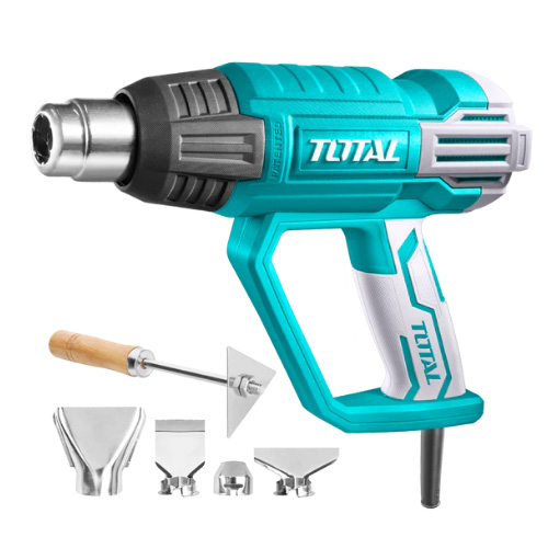 Pistola de calor 2000W. Recomendada para usos como, secar superficies, unir piezas de plástico, retirar adhesivos, descongelar tuberías, etc. Incluye: 1 raspador y 4 boquillas.